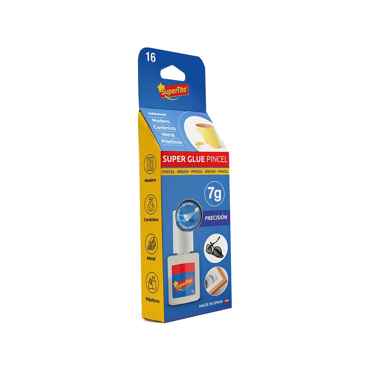 ADHESIVO INSTANTANTEO,BLISTER 7g PINCEL 2416 SUPERTITE UNIÓN DE GRAN DIVERSIDAD DE MATERIALES, COMO METALES, PORCELANA, MÁRMOL, PLÁSTICOS, GOMA, VIDRIO, CAUCHO, MADERA, ETC. ENTRE SÍ O COMBINADOS. EMPLEO EN BRICOLAJE Y EN INDUSTRIA EN GENERAL. PRESENTACIÓN CON PINCEL PARA UNA APLICACIÓN MÁS PRECISA, PRESENTACIÓN 7g. PINCEL