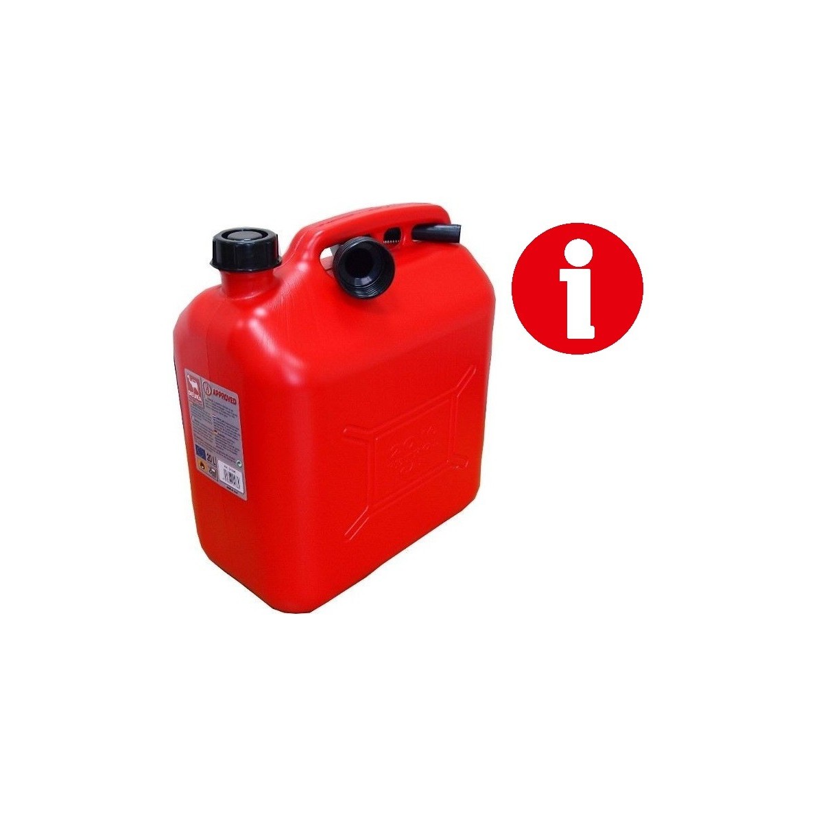 Bidón homologado para el transporte de combustible, hidrocarburos y mercancías peligrosas, fabricado en plástico, con una capacidad de 20 litros y cánula.