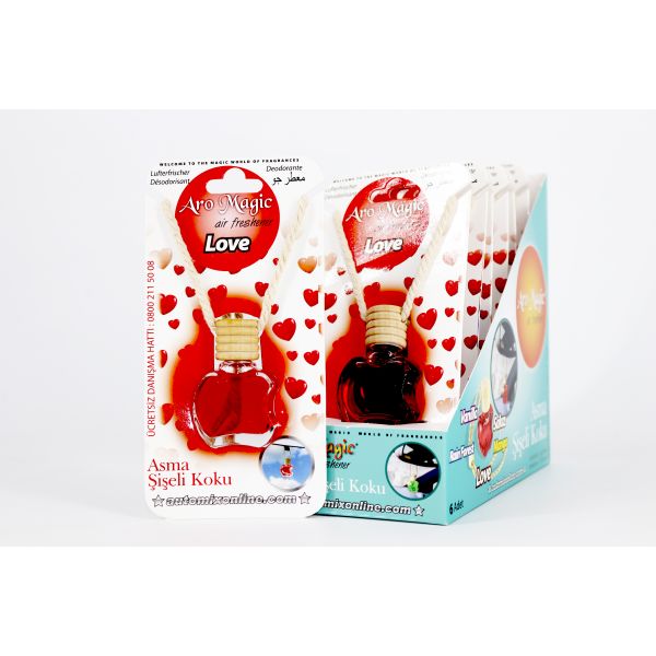 AMBIENTADOR BOTELLITA APPLE LOVE 10ML BLISTER C/6UD AUTOMIX Gracias a la madera en la punta del frasco, puedes utilizar el aroma de forma económica. Se fija fácilmente a los espejos retrovisores interiores de los automóviles con una cuerda que se utiliza para colgarlo. ¿Área de uso? Puedes usarlo en tu auto, casa, oficina,..