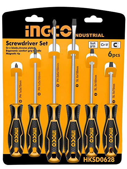 JUEGO 6 DESTORNILLADORES SURTIDOS Descripción - Set destornillador de 6 piezas. - Fabricado en cr-v. - Punta plana: sl5.5 5x75mm, sl5.5 5x100mm y sl6.5 6x150mm. - Punta estrella: ph1 5x75mm, ph1 5x100mm y ph2 6x150mm.