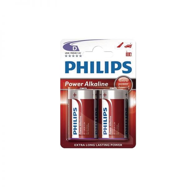 PILA PHILIPS LR20 2UD Blister 2 unidades pilas tetón formato LR20. Características: Formato:LR20/D Voltaje:1,5 V. Compuesto: ALCALINA. Dimensiones: 59,5 x 34,2 mm. SE INDICA PRECIO POR BLISTER DE 2 UNIDADES. SE VENDEN EN CAJAS DE 12 BLISTER