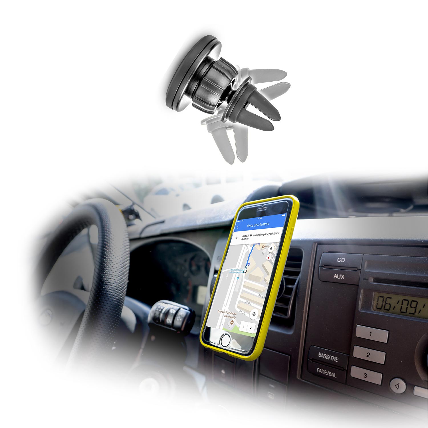 - Soporte con base magnética y enganche para la rejilla de ventilación del automóvil.