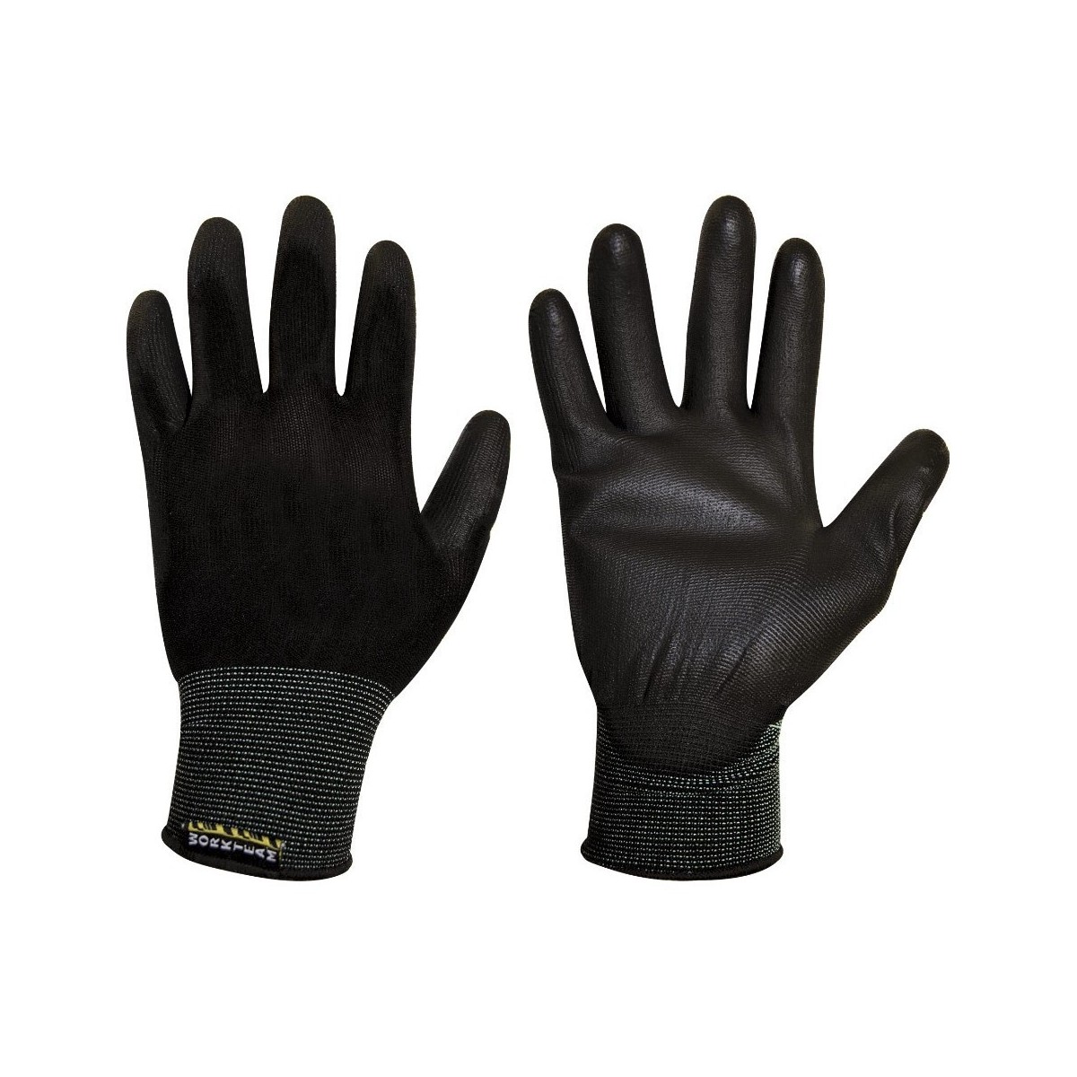 Guantes poliéster-poliuretano color negro, con ribete textil y dorso fresco, puño elástico para un ajuste optimo.