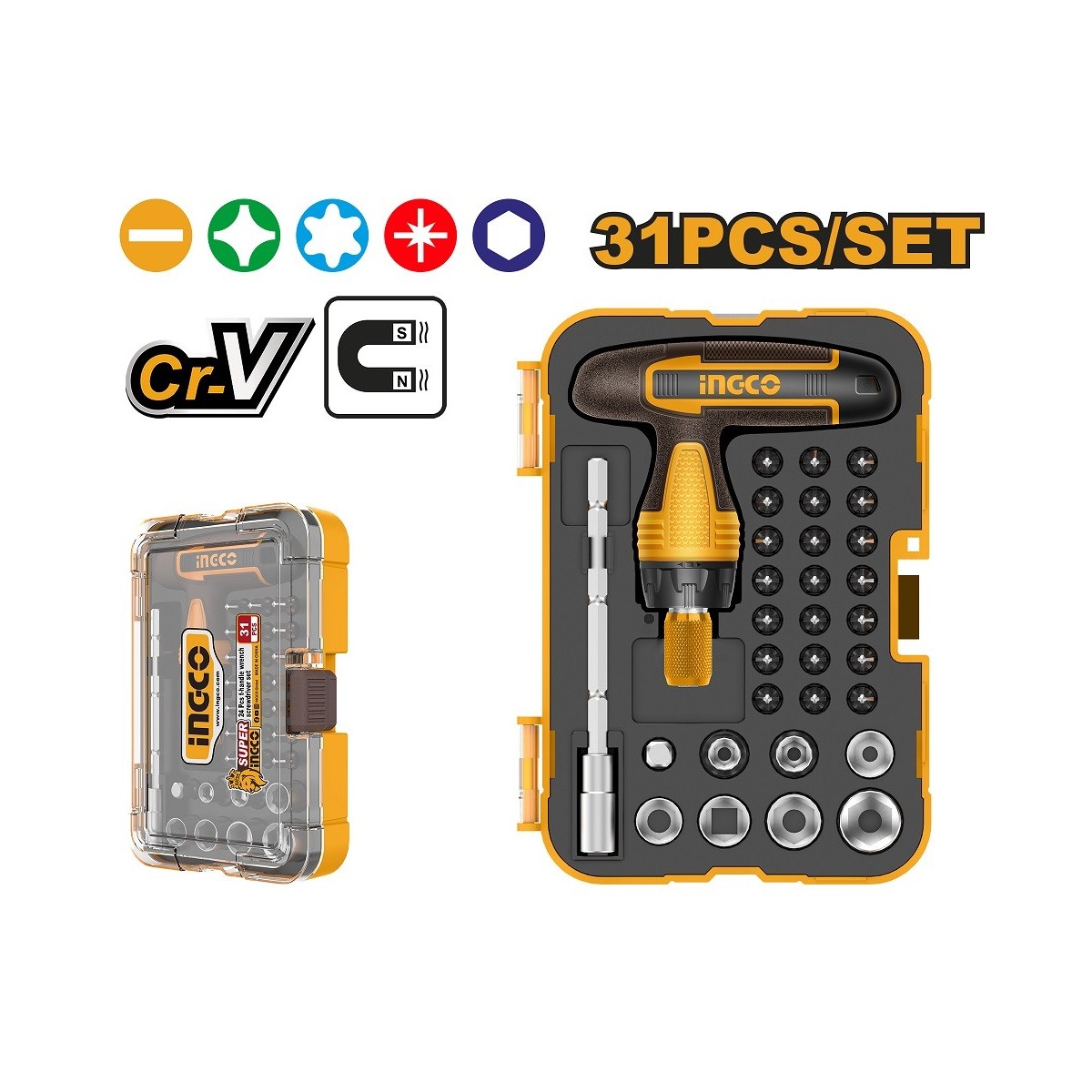 Juego de destornilladores con mango en T de 31 piezas de Ingco: duradero y versátil: esta llave con mango en T de 31 piezas ofrece precisión y durabilidad con un agarre cómodo. Perfecta para uso profesional, doméstico y de bricolaje, tiene las siguientes características: