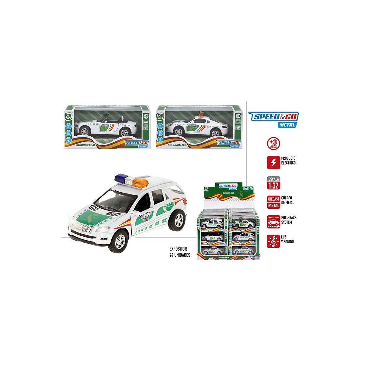 COCHE GUARDIA CIVIL METAL 1:32 LUZ Y SONIDO 3/SURT EXP.24UDS