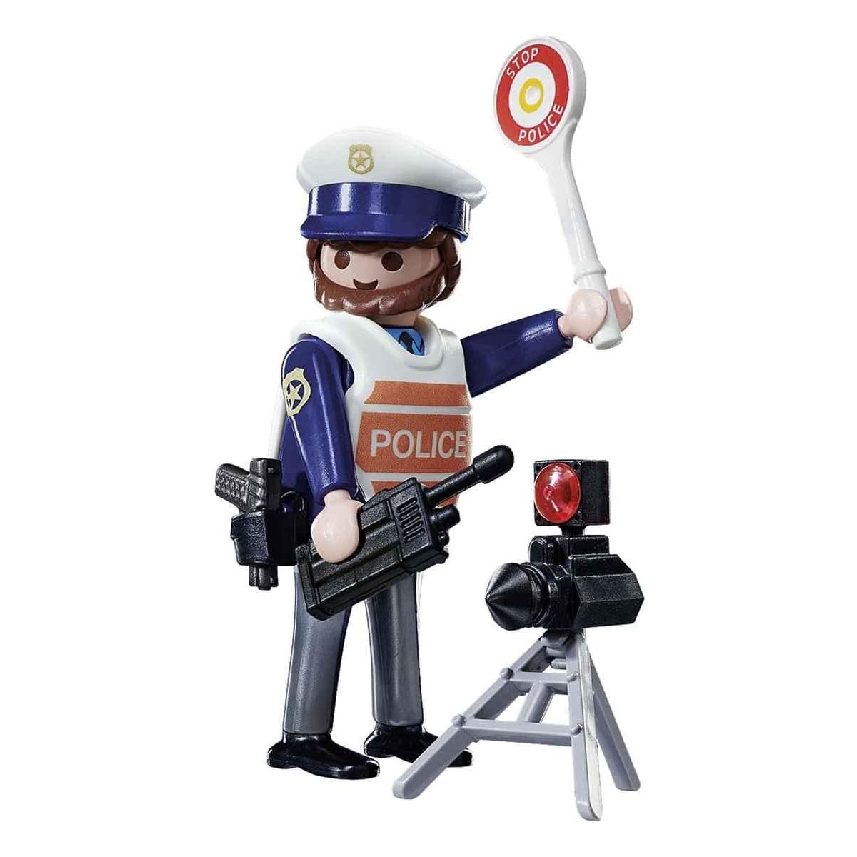 En Playmo City el tráfico va fluido gracias a este Policía. Con la señal, guía a los coches de forma segura a través de cualquier punto de la vía. El set de juguete incluye una figura PLAYMOBIL, una radio, una señal de mano de policía y un radar trampa de velocidad.