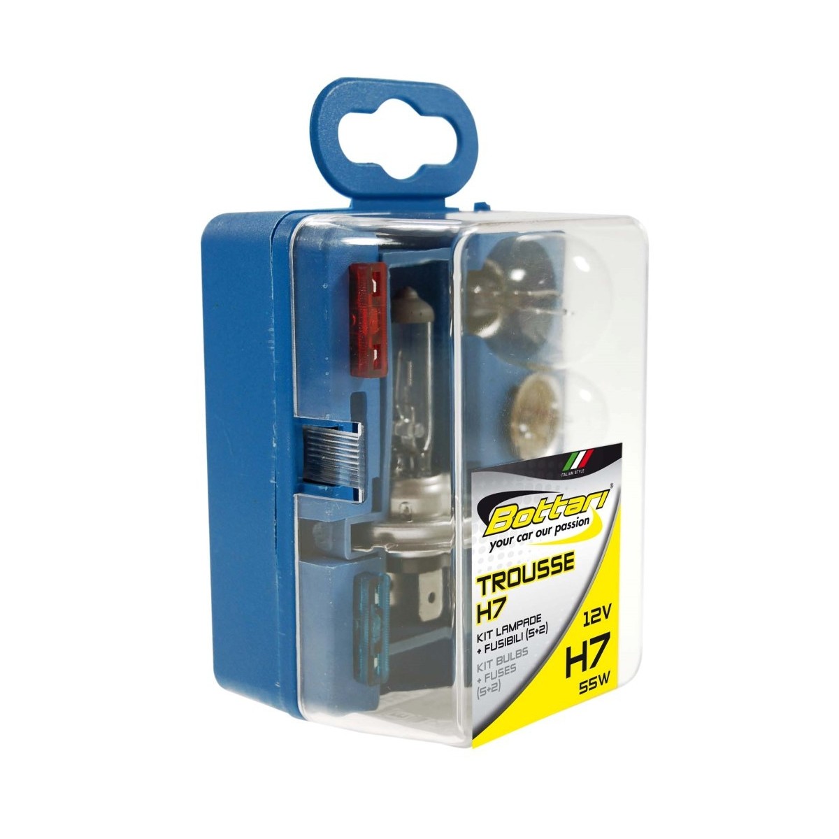 Kit de emergencia con 5 lámparas y 2 fusibles. Compuesto de todo lo esencial para el mantenimiento ordinario de las luces del automóvil. Es práctico para llevar en el maletero o en el garaje. Las lámparas y fusibles del kit son de la más alta calidad y garantizan un 50% más de brillo que las lámparas estándar