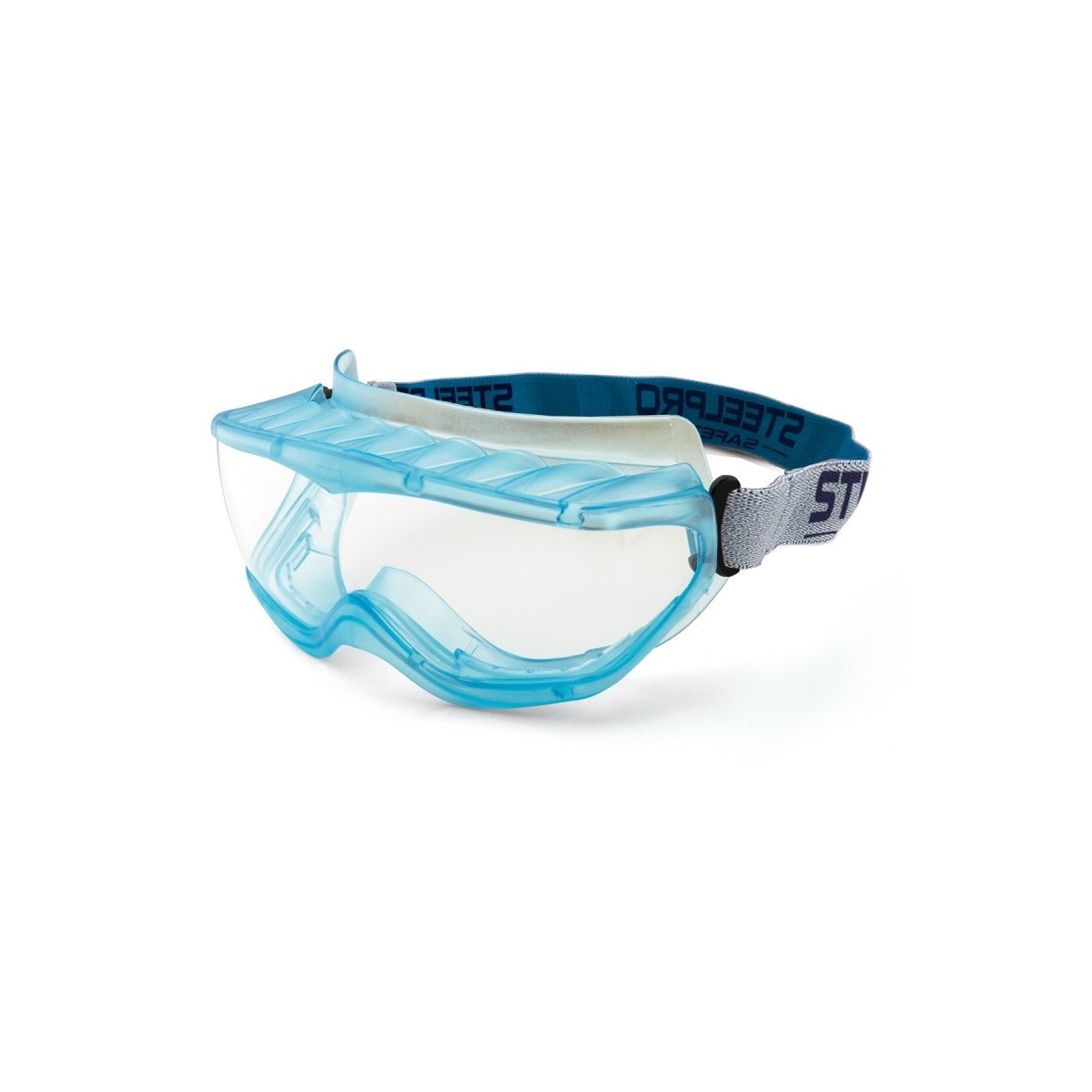 Características: Gafa Integral panorámica estructura de PVC y ocular de policarbonato antiempañante para riesgos mecánicos (proyecciones, gotas de líquidos -3-, polvo grueso -4- y salpicaduras de metales fundidos y sólidos calientes -9-).
