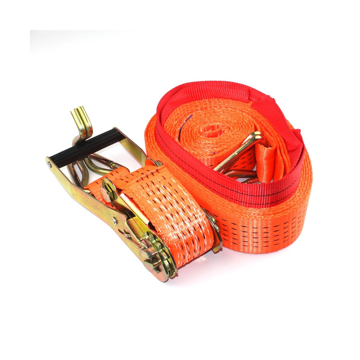 Amarre de cargas 5000KG-8.5M-GC, cierre carraca con gancho cerrado a cada lado, con asa ergonómica plastificada en color rojo, ancho 50 mm, color naranja, largo 8,5 metros